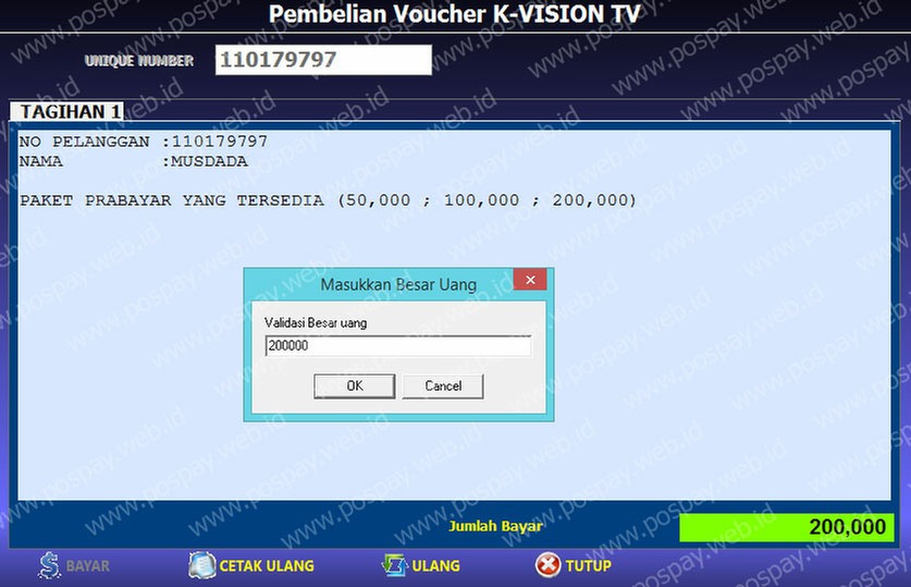 Dari menu TV KABEL > VOUCHER TV KABEL > K-VISION :