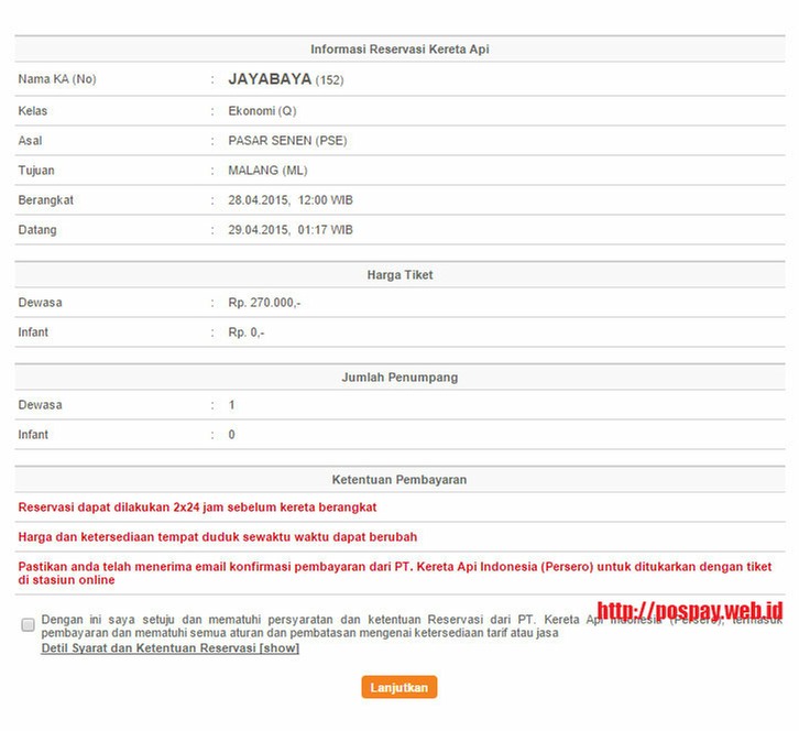 Centang persyaratan dan ketentuan reservasi diatas dan klik Lanjutkan